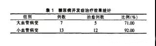 2.2糖尿病并發(fā)癥治療效果統(tǒng)計高壓臭氧大自血療法治療后大血管病變7例中5例治愈,小血管病變13例中12例治愈。結(jié)果見下表。