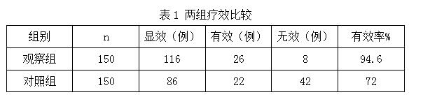 兩組總有效率經(jīng)去切概率法檢驗,P<0.05差異有統(tǒng)計學意義。觀察組的總有效率明顯高于對照組,見表1。